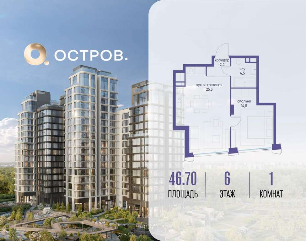 Продаётся 1-комн. квартира от застройщика: общая площадь 46.70 м, жилая 14.50 м, кухня 25.30 м, 6-й этаж, жилой квартал «Остров 12», корпус 2 (секция 1) . Срок сдачи: 1 квартал 2029 года.