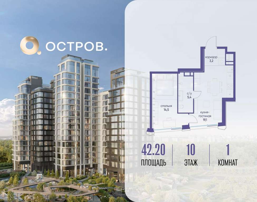 Продаётся 1-комн. квартира от застройщика: общая площадь 42.20 м, жилая 14.50 м, кухня 19.10 м, 10-й этаж, жилой квартал «Остров 12», корпус 2 (секция 1) . Срок сдачи: 1 квартал 2029 года.