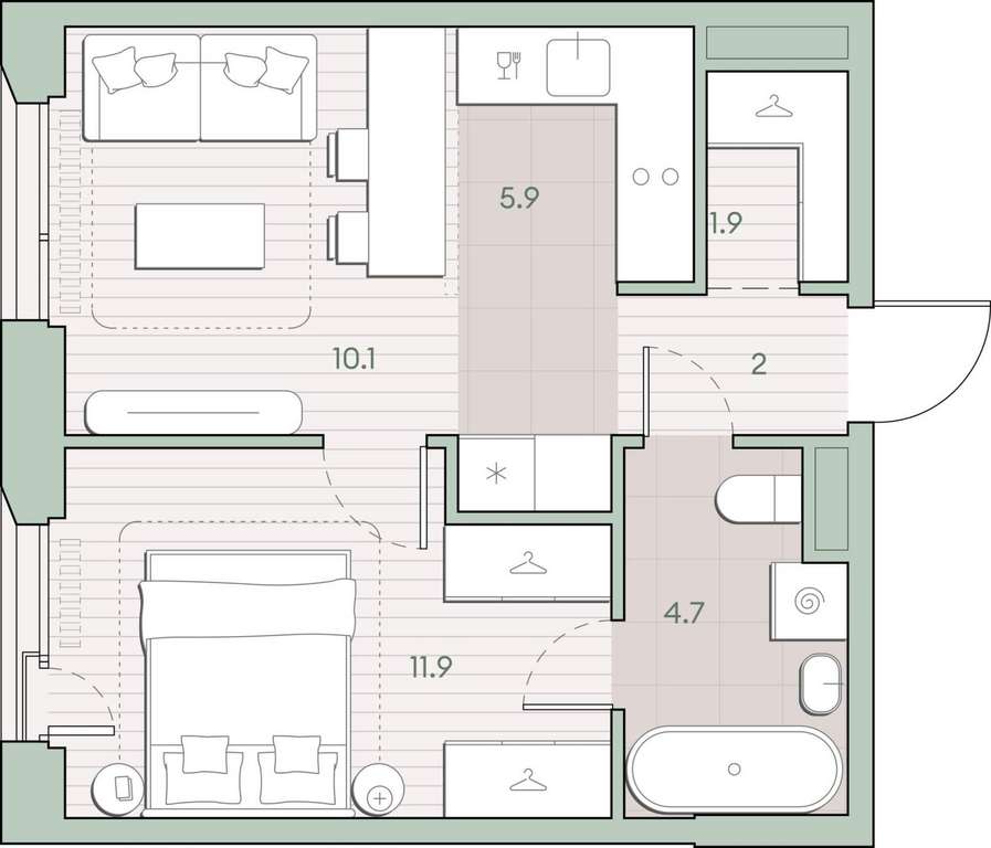 Жилая площадь 22 м2, кухня 5.9 м2, квартира без отделки, комнаты изолированные.