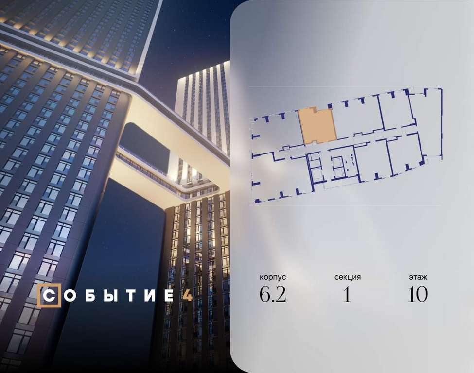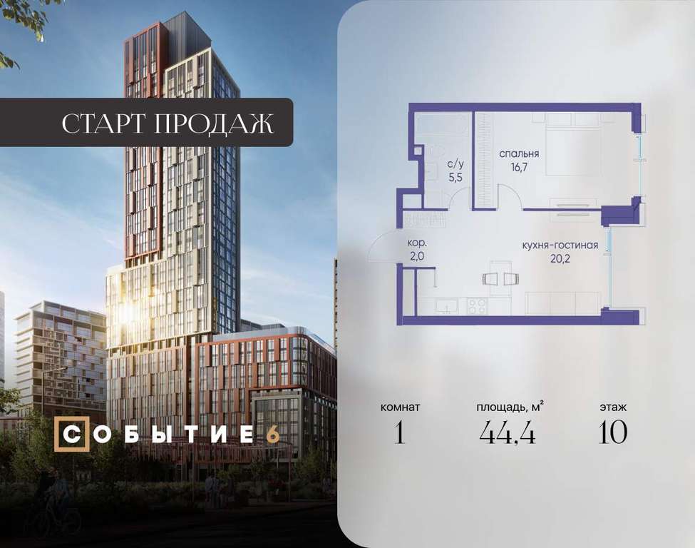 Продаётся 1-комнатная квартира от застройщика: общая площадь 44.40 м, жилая 16.70 м, кухня 20.20 м, 10-й этаж, жилой квартал «Событие-6», корпус 2 (секция 1) Срок сдачи: 1 квартал 2029 года.