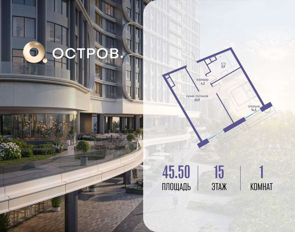 Продаётся 1-комн. квартира от застройщика: общая площадь 45.50 м, жилая 14.50 м, кухня 20.90 м, 15-й этаж, жилой квартал «Остров 7», корпус 7 (секция 2) . Срок сдачи: 3 квартал 2028 года.