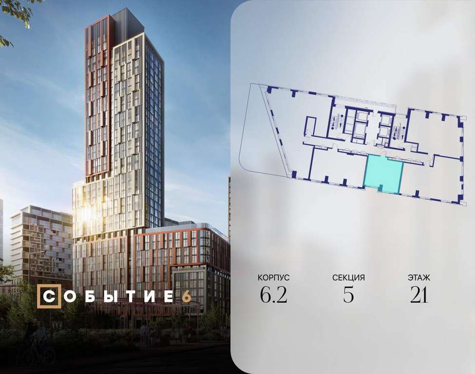 Продаётся 1-комнатная квартира от застройщика: общая площадь 38.30 м, жилая 14.60 м, кухня 15.70 м, 21-й этаж, жилой квартал «Событие-6», корпус 2 (секция 5) Срок сдачи: 1 квартал 2029 года.
