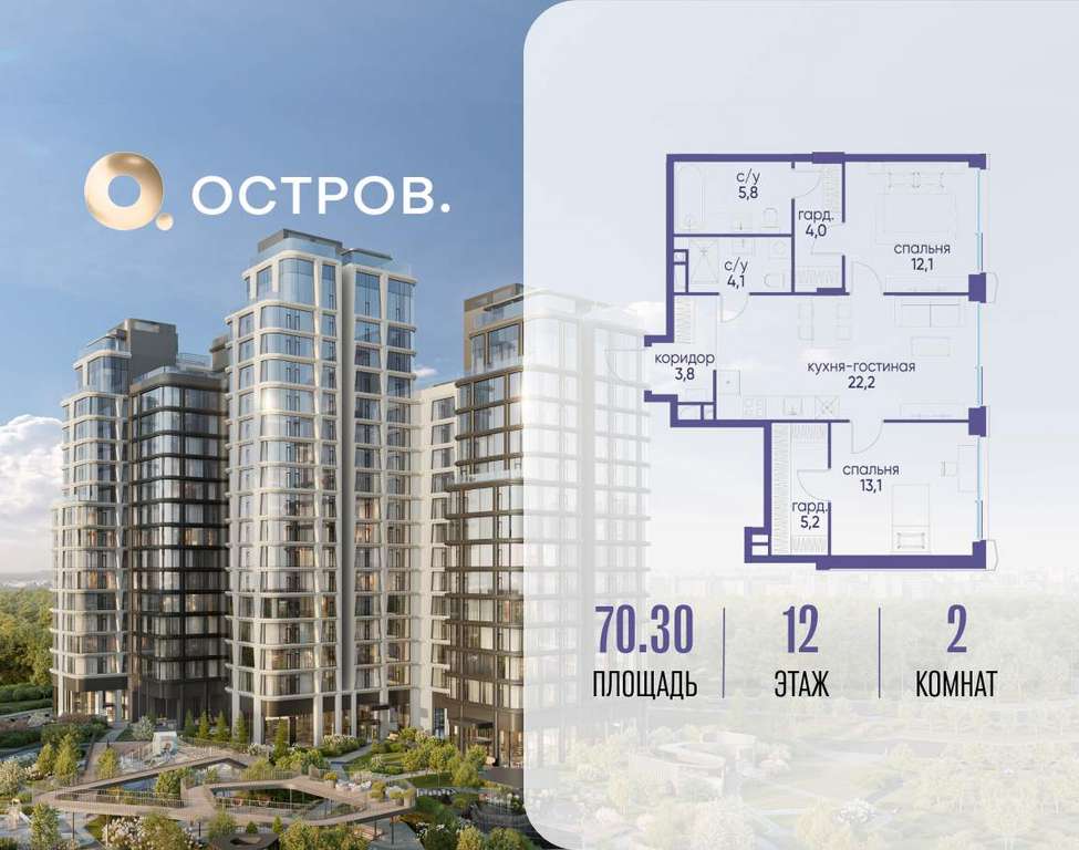 Продаётся 2-комн. квартира от застройщика: общая площадь 70.30 м, жилая 25.20 м, кухня 22.20 м, 12-й этаж, жилой квартал «Остров 12», корпус 3 (секция 1) . Срок сдачи: 1 квартал 2029 года.