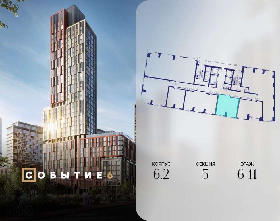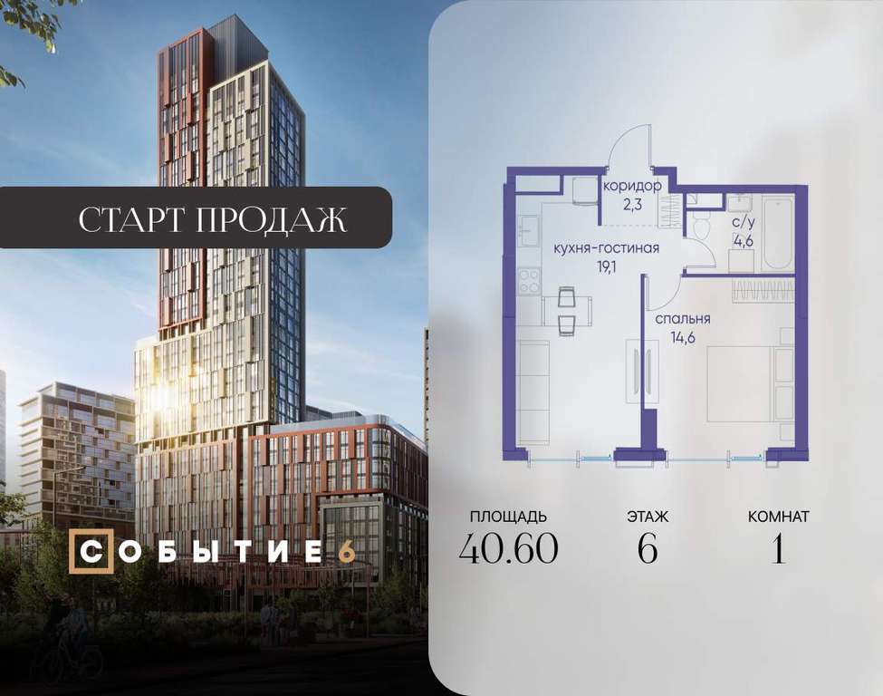 Продаётся 1-комнатная квартира от застройщика: общая площадь 40.60 м, жилая 14.60 м, кухня 19.10 м, 6-й этаж, жилой квартал «Событие-6», корпус 2 (секция 5) Срок сдачи: 1 квартал 2029 года.