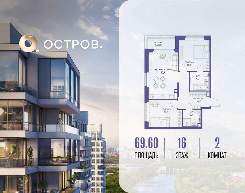Продаётся 2-комн. квартира от застройщика: общая площадь 69.60 м, жилая 27.80 м, кухня 20.70 м, 16-й этаж, жилой квартал «Остров 6», корпус 1 (секция 1) . Срок сдачи: 4 квартал 2025 года.