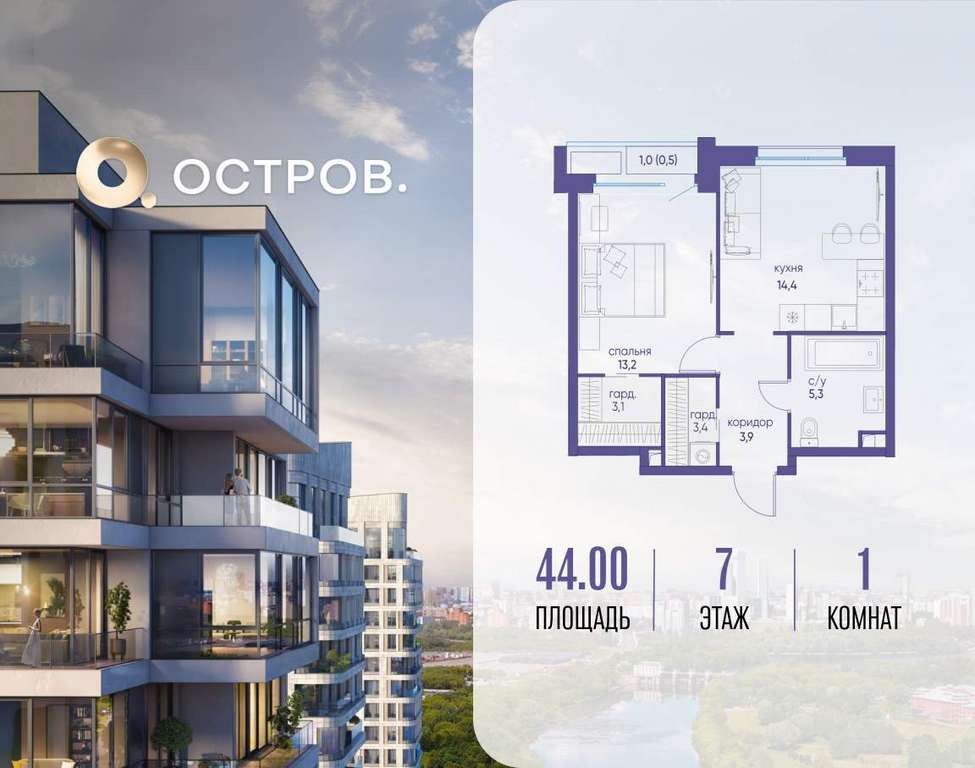 Продаётся 1-комн. квартира от застройщика: общая площадь 44.00 м, жилая 13.20 м, кухня 14.40 м, 7-й этаж, жилой квартал «Остров 6», корпус 3 (секция 1) . Срок сдачи: 4 квартал 2025 года.