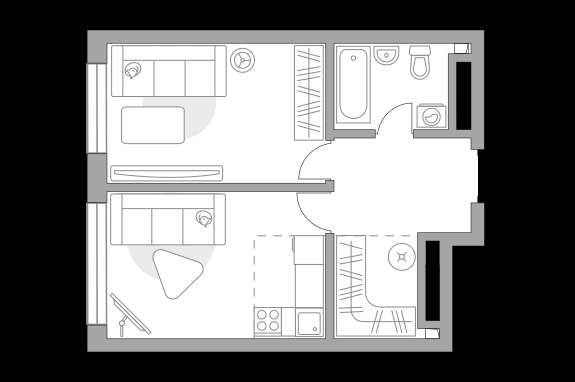 Жилая площадь 23.69 м2, кухня 3.2 м2. Площадь комнат: 12.94/10.75 м2, квартира без отделки, окна выходят во двор.
