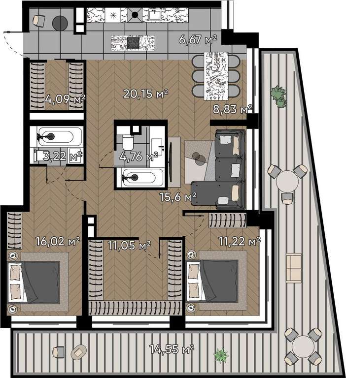 Квартиры с просторными террасами - выход на свежий воздух прямо из дома, гармония природы и городской роскоши.