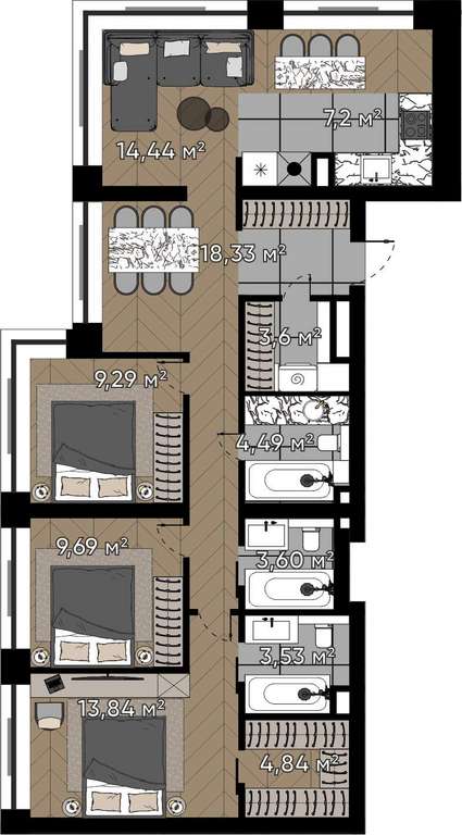 Квартиры с просторными террасами - выход на свежий воздух прямо из дома, гармония природы и городской роскоши.