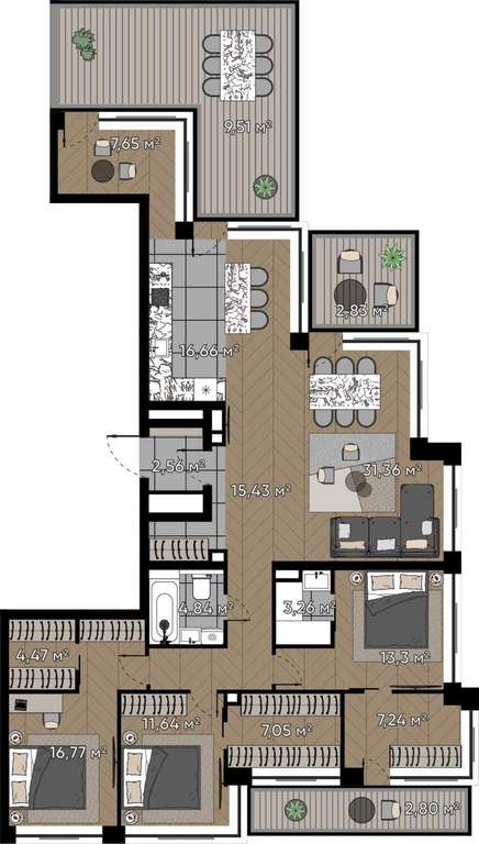 Квартиры с просторными террасами - выход на свежий воздух прямо из дома, гармония природы и городской роскоши.