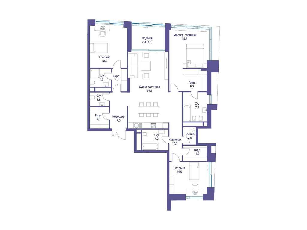 В квартире продуманная функциональная планировка с просторной кухней 34.50 м2. Жилая площадь - 57.20 м2. Высота потолка от 3,65 м. Изолированные комнаты, 4 санузла(1 раздельный и 3 совмещенных) . Окна на противоположные стороны. Виды на природный парк и реку.