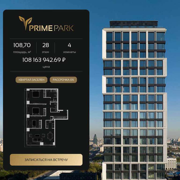 Квартира располагается на 28 этаже 41-этажного дома в ЖК Прайм Парк.