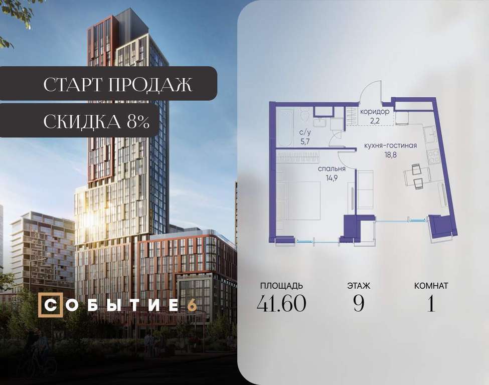Продаётся 1-комнатная квартира от застройщика: общая площадь 41.60 м, жилая 14.90 м, кухня 18.80 м, 9-й этаж, жилой квартал «Событие-6», корпус 2 (секция 5) Срок сдачи: 1 квартал 2029 года.