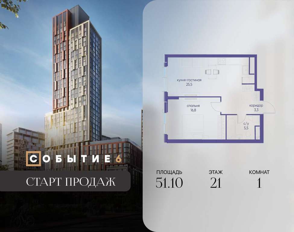 Продаётся 1-комнатная квартира от застройщика: общая площадь 51.10 м, жилая 16.80 м, кухня 25.50 м, 21-й этаж, жилой квартал «Событие-6», корпус 2 (секция 1) Срок сдачи: 1 квартал 2029 года.