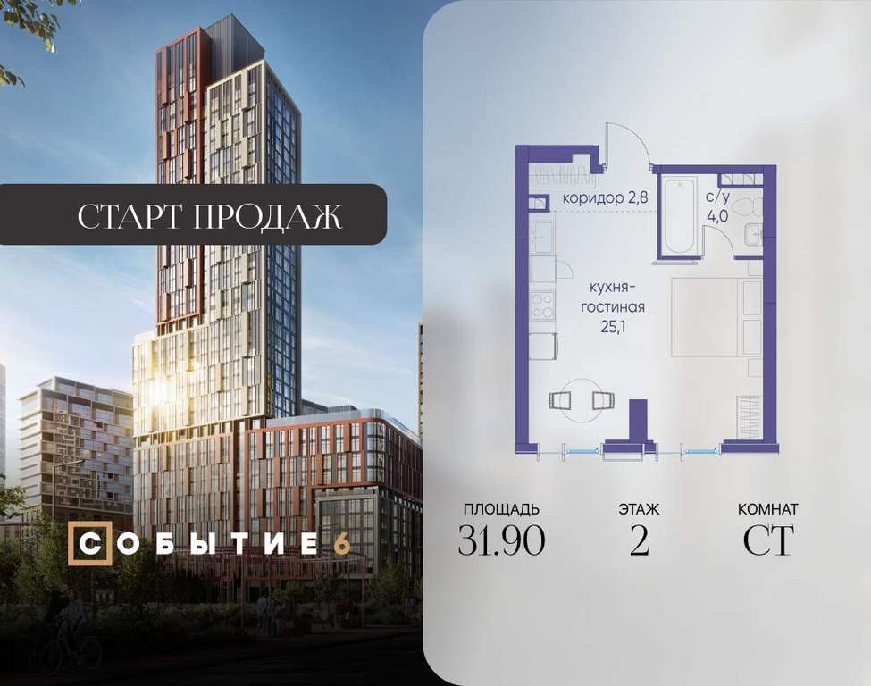Продаётся квартира-студия от застройщика: общая площадь 31.90 м, жилая 20.10 м, кухня 5.00 м, 2-й этаж, жилой квартал «Событие-6», корпус 2 (секция 5) Срок сдачи: 1 квартал 2029 года.