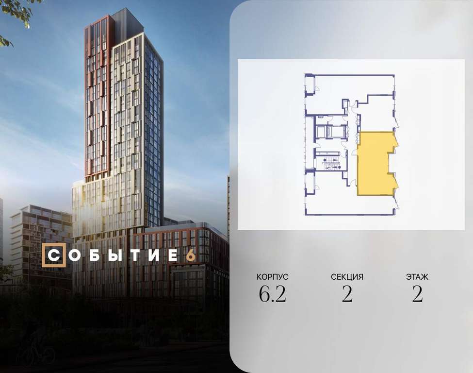 Продаётся 2-комнатная квартира от застройщика: общая площадь 59.80 м, жилая 30.10 м, кухня 18.40 м, 2-й этаж, жилой квартал «Событие-6», корпус 2 (секция 2) Срок сдачи: 1 квартал 2029 года.