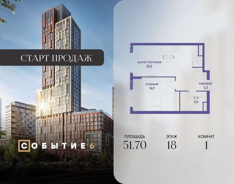 Продаётся 1-комнатная квартира от застройщика: общая площадь 51.70 м, жилая 16.90 м, кухня 25.90 м, 18-й этаж, жилой квартал «Событие-6», корпус 2 (секция 1) Срок сдачи: 1 квартал 2029 года.
