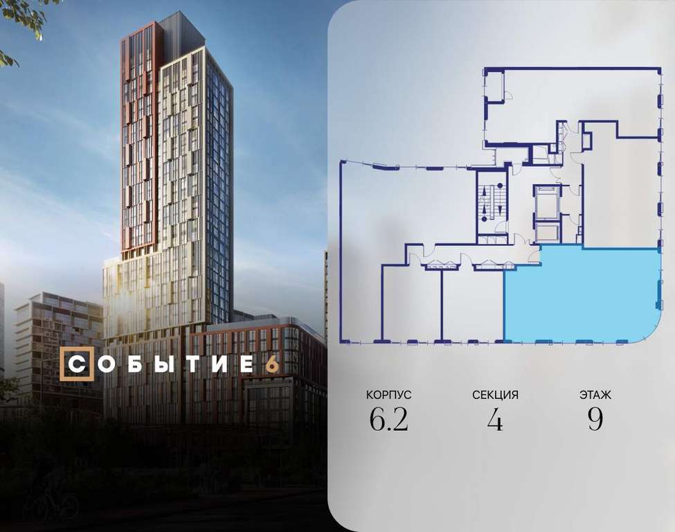 Продаётся 3-комнатная квартира от застройщика: общая площадь 99.00 м, жилая 45.50 м, кухня 27.20 м, 9-й этаж, жилой квартал «Событие-6», корпус 2 (секция 4) Срок сдачи: 1 квартал 2029 года.