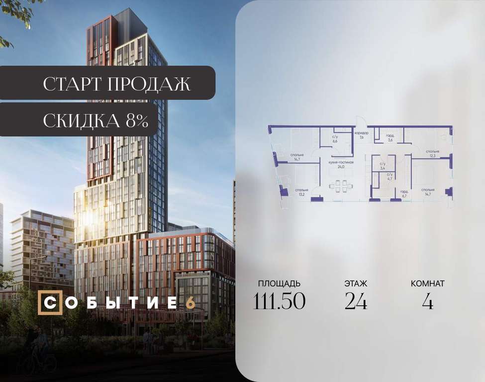 Продаётся 4-комнатная квартира от застройщика: общая площадь 111.50 м, жилая 54.90 м, кухня 24.00 м, 24-й этаж, жилой квартал «Событие-6», корпус 2 (секция 1) Срок сдачи: 1 квартал 2029 года.