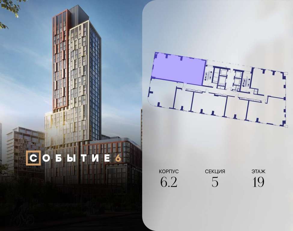 Продаётся 4-комнатная квартира от застройщика: общая площадь 121.90 м, жилая 56.00 м, кухня 23.40 м, 19-й этаж, жилой квартал «Событие-6», корпус 2 (секция 5) Срок сдачи: 1 квартал 2029 года.