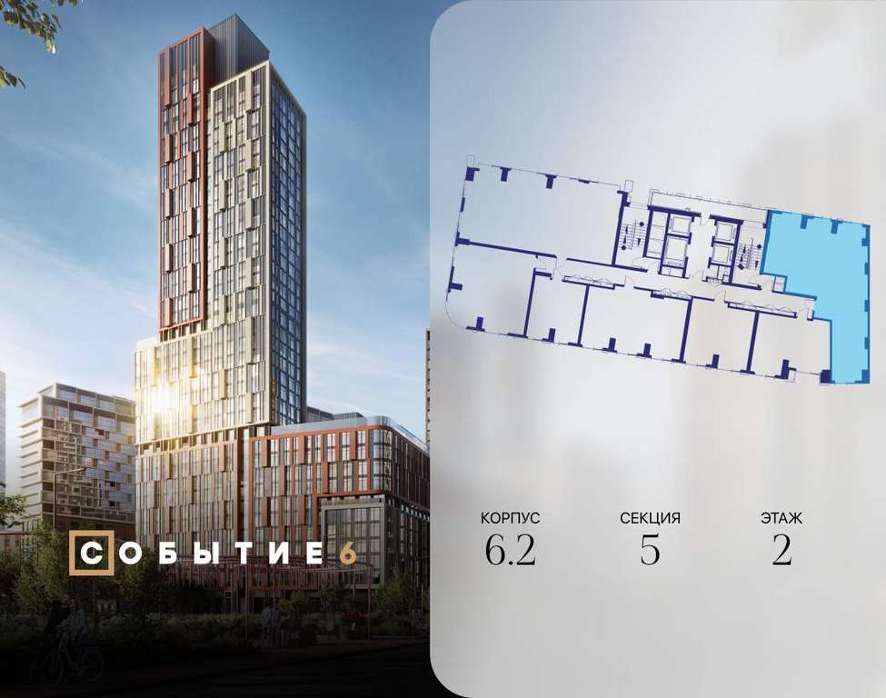 Продаётся 3-комнатная квартира от застройщика: общая площадь 108.30 м, жилая 45.20 м, кухня 30.30 м, 2-й этаж, жилой квартал «Событие-6», корпус 2 (секция 5) Срок сдачи: 1 квартал 2029 года.
