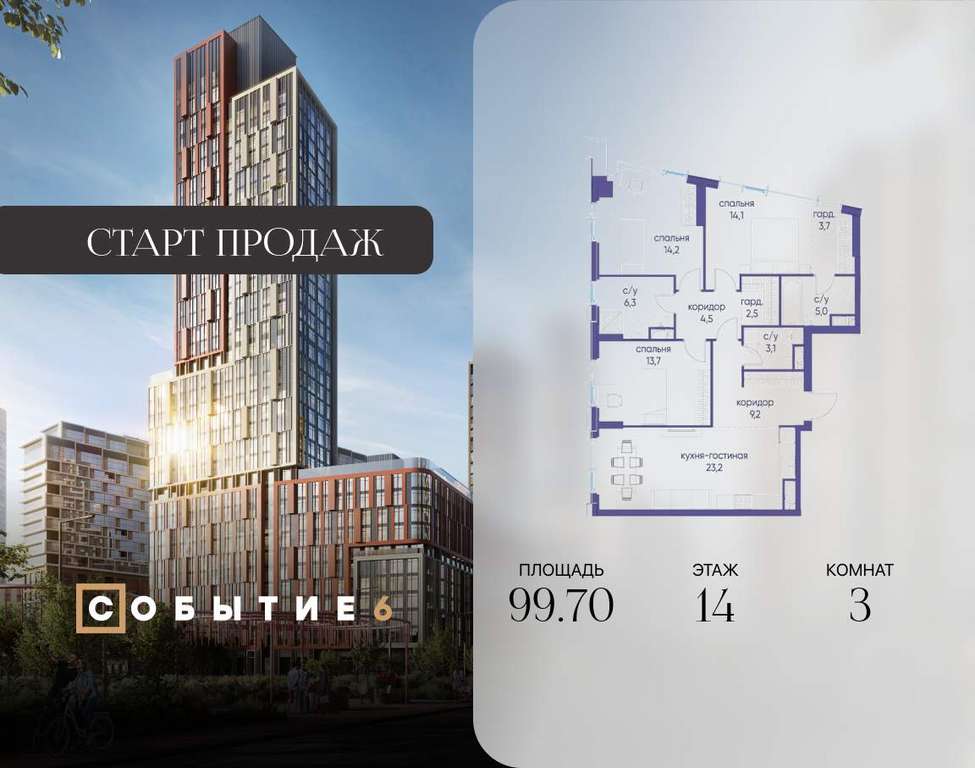 Продаётся 3-комнатная квартира от застройщика: общая площадь 99.70 м, жилая 42.00 м, кухня 23.20 м, 14-й этаж, жилой квартал «Событие-6», корпус 2 (секция 1) Срок сдачи: 1 квартал 2029 года.