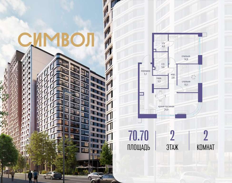 Продается 2-комнатная квартира от застройщика: общая площадь 70.70 м, жилая 25.00 м, кухня 24.90 м, 2-й этаж, жилой квартал «Гордость», корпус 36 (секция 5) . Срок сдачи: 2 квартал 2029 года.