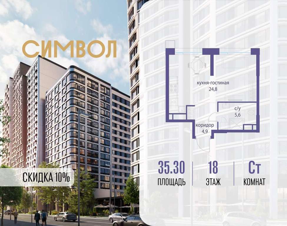 Продается квартира-студия от застройщика: общая площадь 35.30 м, жилая 10.00 м, кухня 14.80 м, 18-й этаж, жилой квартал «Гордость», корпус 36 (секция 4) . Срок сдачи: 2 квартал 2029 года.