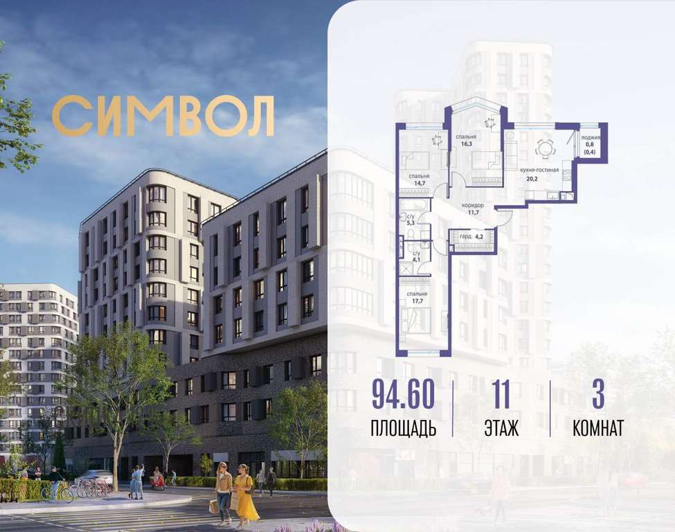 Продается 3-комнатная квартира от застройщика: общая площадь 94.60 м, жилая 48.70 м, кухня 20.20 м, 11-й этаж, жилой квартал «Вдохновение», корпус 31 (секция 2) . Срок сдачи: 4 квартал 2025 года.