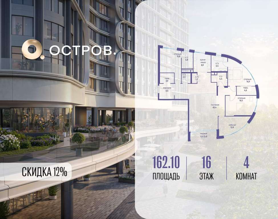 Продаётся 4-комн. квартира от застройщика: общая площадь 162.10 м, жилая 60.00 м, кухня 74.30 м, 16-й этаж, жилой квартал «Остров 7», корпус 4 (секция 1) . Срок сдачи: 1 квартал 2028 года.