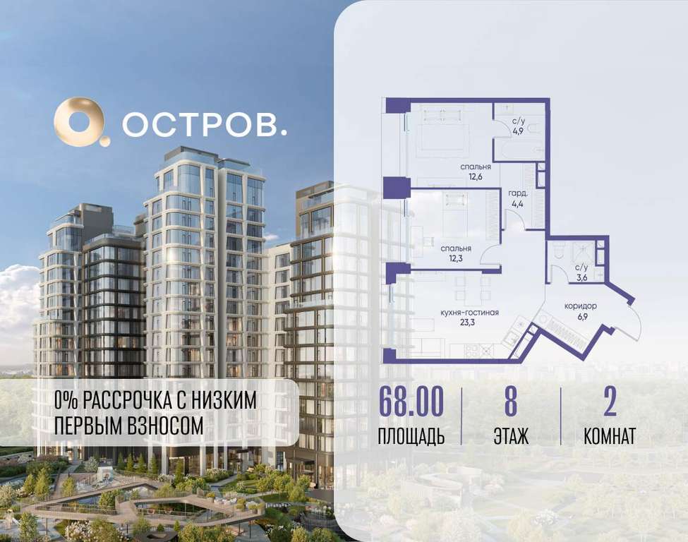 Продаётся 2-комн. квартира от застройщика: общая площадь 68.00 м, жилая 24.90 м, кухня 23.30 м, 8-й этаж, жилой квартал «Остров 12», корпус 1 (секция 1) . Срок сдачи: 1 квартал 2029 года.