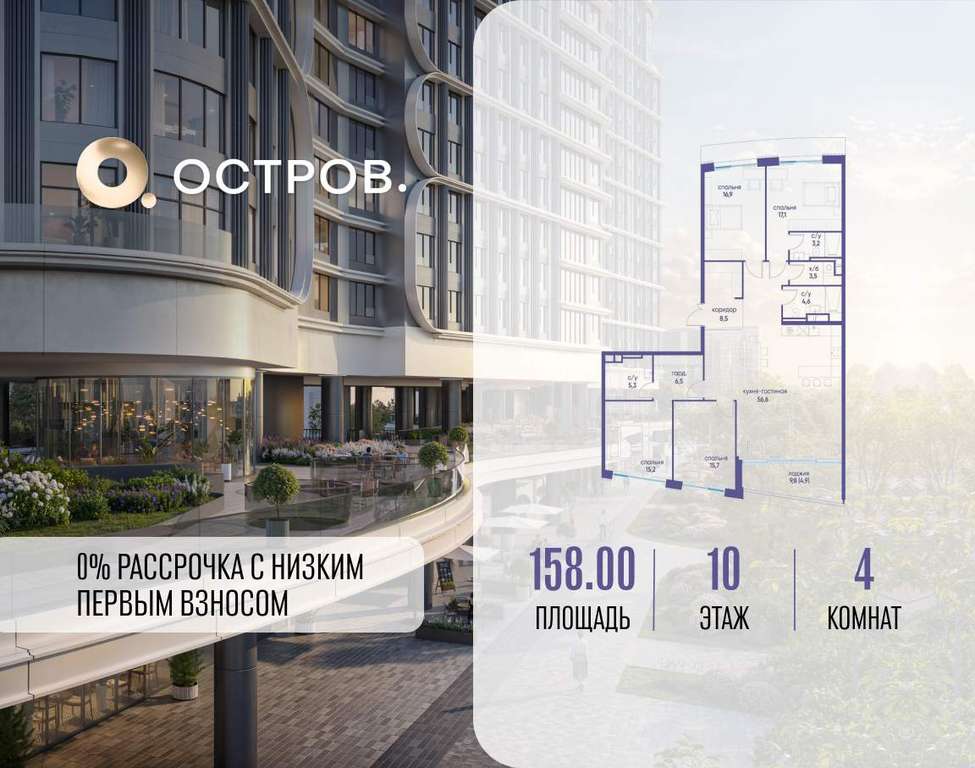 Продаётся 4-комн. квартира от застройщика: общая площадь 158.00 м, жилая 64.90 м, кухня 56.60 м, 10-й этаж, жилой квартал «Остров 7», корпус 4 (секция 3) . Срок сдачи: 1 квартал 2028 года.