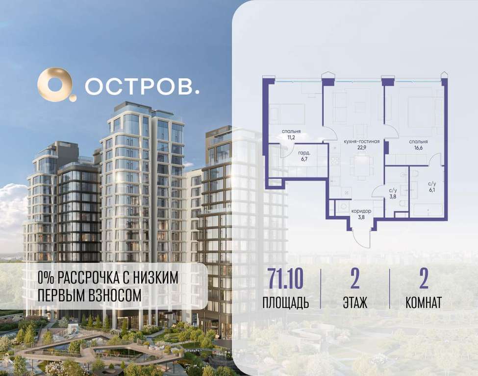 Продаётся 2-комн. квартира от застройщика: общая площадь 71.10 м, жилая 27.80 м, кухня 22.90 м, 2-й этаж, жилой квартал «Остров 12», корпус 2 (секция 1) . Срок сдачи: 1 квартал 2029 года.