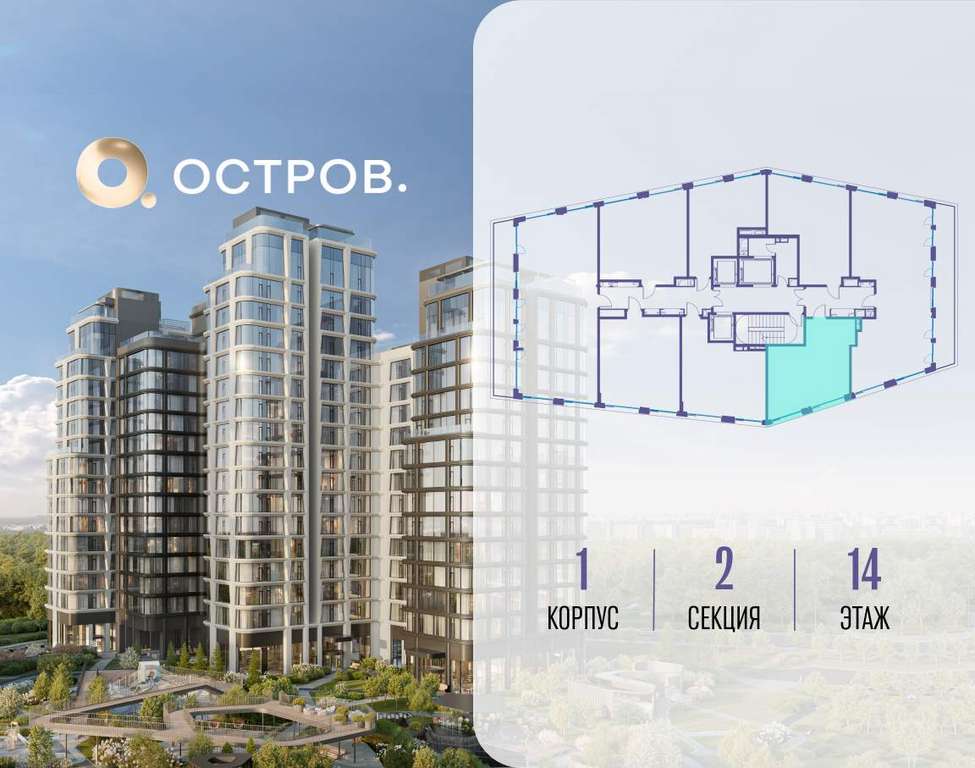 Продаётся 1-комн. квартира от застройщика: общая площадь 44.70 м, жилая 18.50 м, кухня 17.10 м, 14-й этаж, жилой квартал «Остров 12», корпус 1 (секция 2) . Срок сдачи: 1 квартал 2029 года.