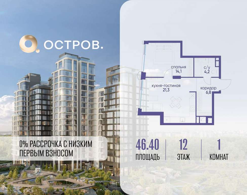 Продаётся 1-комн. квартира от застройщика: общая площадь 46.40 м, жилая 14.10 м, кухня 21.30 м, 12-й этаж, жилой квартал «Остров 12», корпус 3 (секция 1) . Срок сдачи: 1 квартал 2029 года.