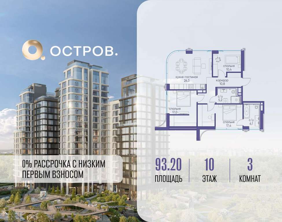 Продаётся 3-комн. квартира от застройщика: общая площадь 93.20 м, жилая 44.80 м, кухня 26.30 м, 10-й этаж, жилой квартал «Остров 12», корпус 2 (секция 2) . Срок сдачи: 1 квартал 2029 года.