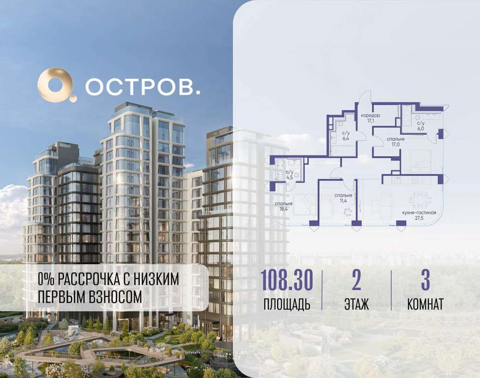 Продаётся 3-комн. квартира от застройщика: общая площадь 108.30 м, жилая 46.80 м, кухня 27.50 м, 2-й этаж, жилой квартал «Остров 12», корпус 2 (секция 2) . Срок сдачи: 1 квартал 2029 года.