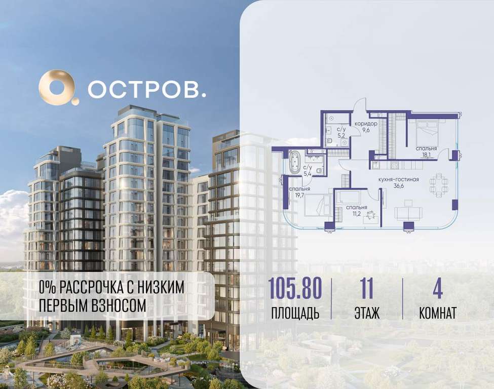 Продаётся 4-комн. квартира от застройщика: общая площадь 105.80 м, жилая 49.00 м, кухня 36.60 м, 11-й этаж, жилой квартал «Остров 12», корпус 1 (секция 3) . Срок сдачи: 1 квартал 2029 года.