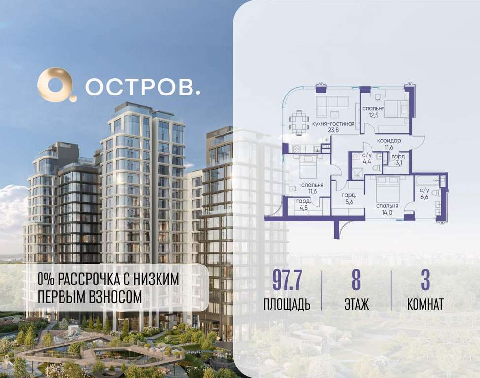 Продаётся 3-комн. квартира от застройщика: общая площадь 97.70 м, жилая 38.10 м, кухня 23.80 м, 8-й этаж, жилой квартал «Остров 12», корпус 1 (секция 2) . Срок сдачи: 1 квартал 2029 года.