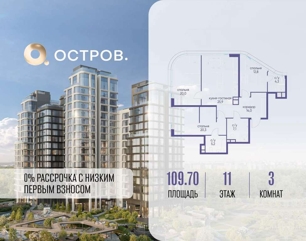 Продаётся 3-комн. квартира от застройщика: общая площадь 109.70 м, жилая 53.10 м, кухня 25.90 м, 11-й этаж, жилой квартал «Остров 12», корпус 6 (секция 1) . Срок сдачи: 1 квартал 2029 года.