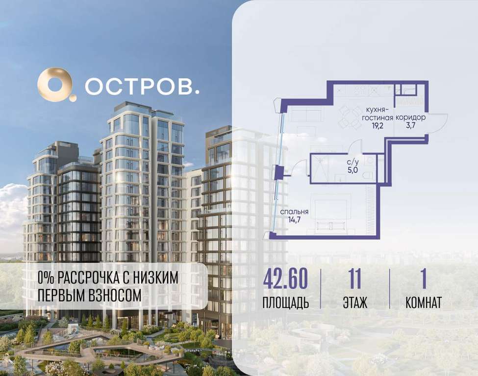 Продаётся 1-комн. квартира от застройщика: общая площадь 42.60 м, жилая 14.70 м, кухня 19.20 м, 11-й этаж, жилой квартал «Остров 12», корпус 3 (секция 1) . Срок сдачи: 1 квартал 2029 года.