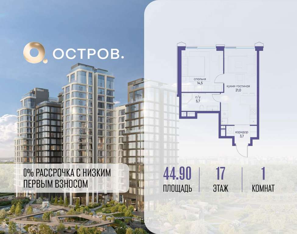 Продаётся 1-комн. квартира от застройщика: общая площадь 44.90 м, жилая 14.50 м, кухня 21.00 м, 17-й этаж, жилой квартал «Остров 12», корпус 2 (секция 1) . Срок сдачи: 1 квартал 2029 года.