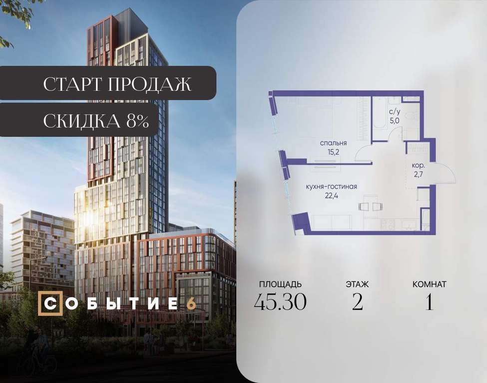 Продаётся 1-комнатная квартира от застройщика: общая площадь 45.30 м, жилая 15.20 м, кухня 22.40 м, 2-й этаж, жилой квартал «Событие-6», корпус 2 (секция 1) Срок сдачи: 1 квартал 2029 года.