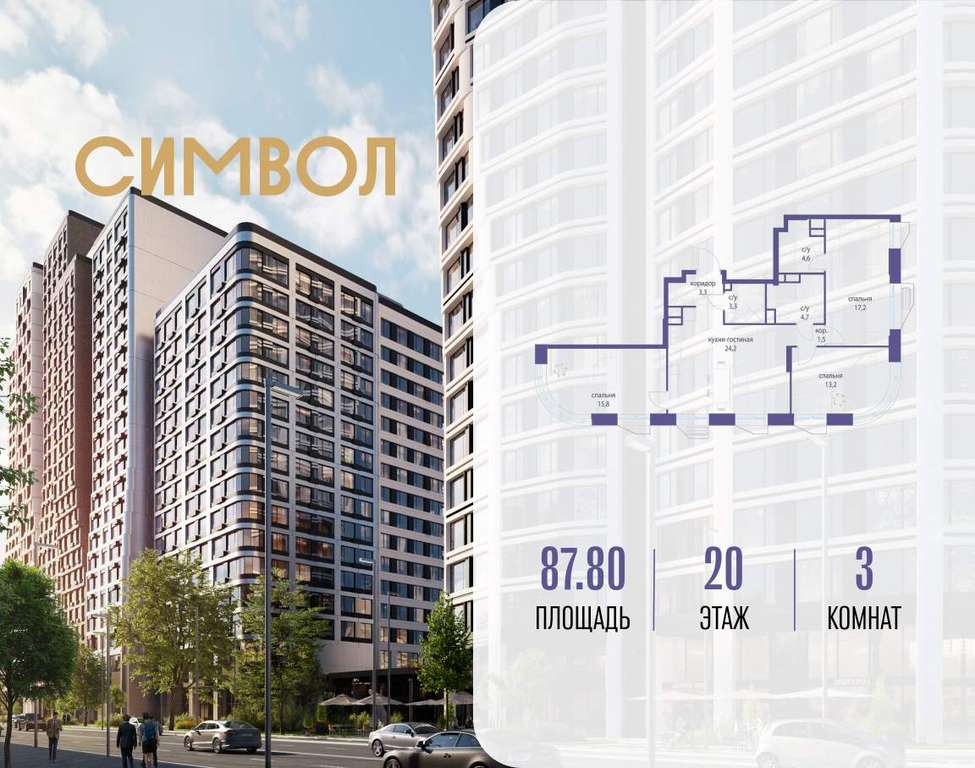 Продается 3-комнатная квартира от застройщика: общая площадь 87.80 м, жилая 46.20 м, кухня 24.20 м, 20-й этаж, жилой квартал «Гордость», корпус 36 (секция 1) . Срок сдачи: 2 квартал 2029 года.