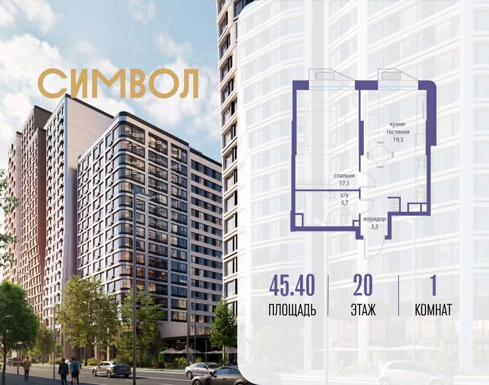 Продается 1-комнатная квартира от застройщика: общая площадь 45.40 м, жилая 17.10 м, кухня 19.30 м, 20-й этаж, жилой квартал «Гордость», корпус 36 (секция 4) . Срок сдачи: 2 квартал 2029 года.