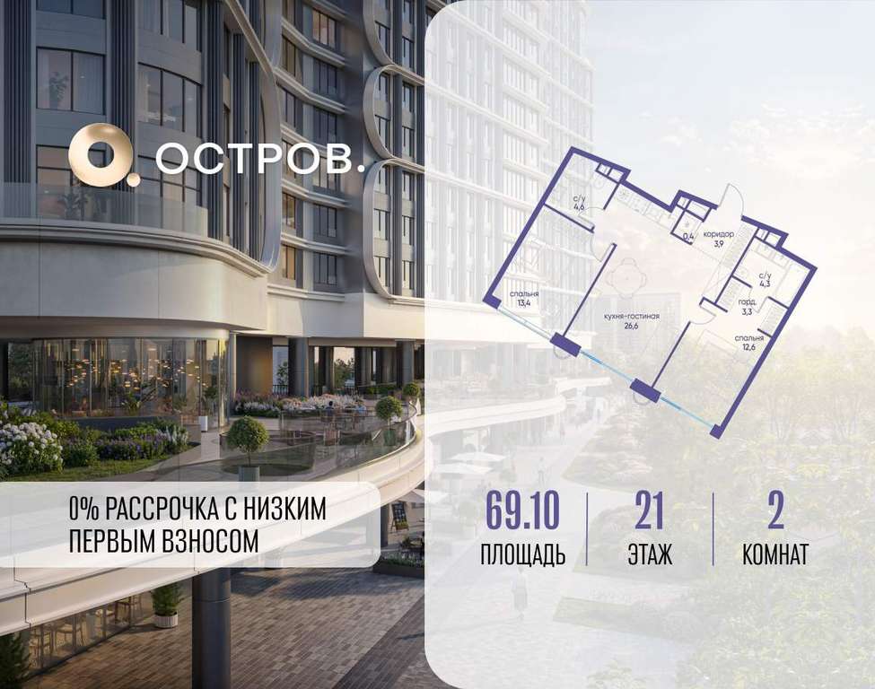 ОСТРОВ от Донстрой - жилой комплекс на западе Москвы, в Мневниковской пойме. Уникальное преимущество комплекса - в том, что он обособлен от города рекой и природным парком (650 га) . Благодаря природному окружению эта территория имеет лучший экологический рейтинг в столице. Кварталы ОСТРОВА объединены ландшафтным дизайном в единое пространство - с набережными и Центральным бульваром. На ОСТРОВЕ любые объекты, необходимые для полноценной жизни и отдыха, находятся на расстоянии 15-минутной прогулки. Торговый центр и супермаркеты, кафе и рестораны, фитнес, салоны красоты, школы и детские сады. А также крупнейший в Москве спортивный кластер.