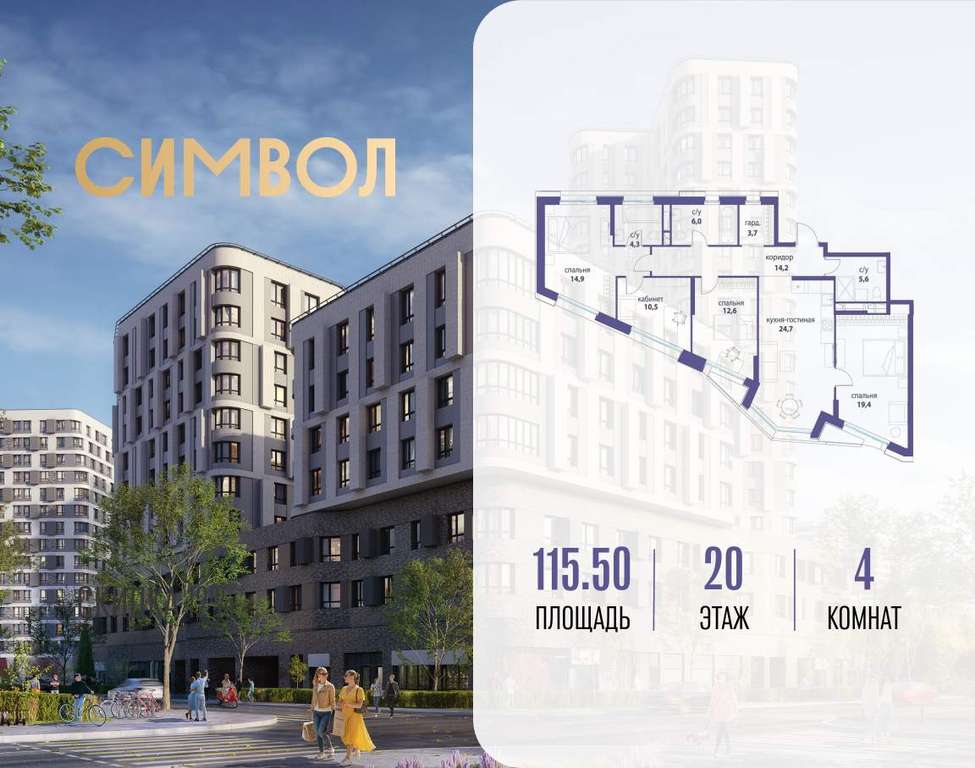 Продается 4-комнатная квартира от застройщика: общая площадь 115.50 м, жилая 57.40 м, кухня 24.70 м, 20-й этаж, жилой квартал «Вдохновение», корпус 32 (секция 1) . Срок сдачи: 4 квартал 2027 года.