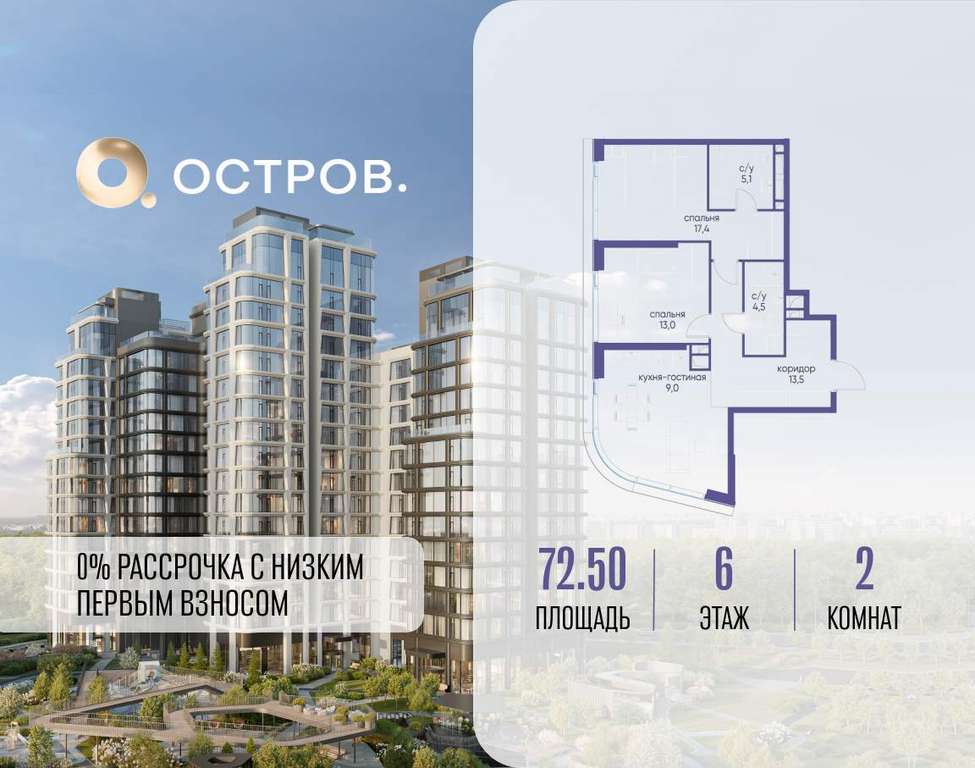 Продаётся 2-комн. квартира от застройщика: общая площадь 72.50 м, жилая 30.40 м, кухня 9.00 м, 6-й этаж, жилой квартал «Остров 12», корпус 3 (секция 1) . Срок сдачи: 1 квартал 2029 года.