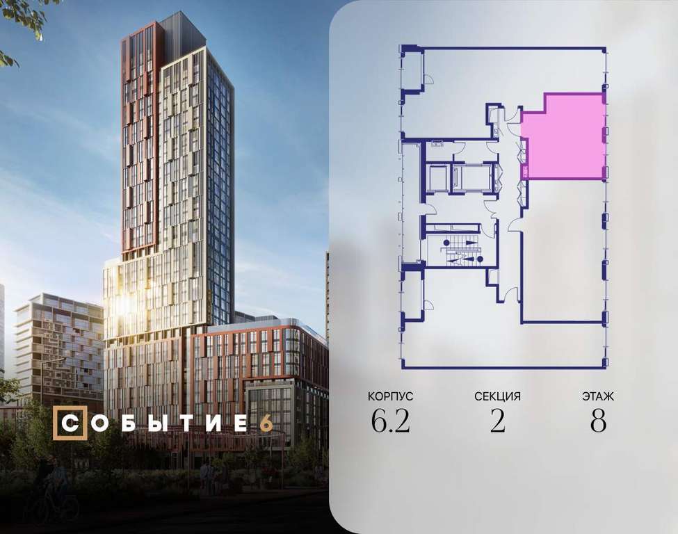 Продаётся квартира-студия от застройщика: общая площадь 33.90 м, жилая 20.00 м, кухня 5.00 м, 8-й этаж, жилой квартал «Событие-6», корпус 2 (секция 2) Срок сдачи: 1 квартал 2029 года.