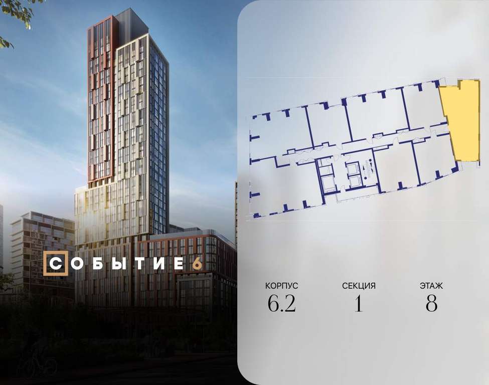 Продаётся 2-комнатная квартира от застройщика: общая площадь 73.60 м, жилая 30.00 м, кухня 22.00 м, 8-й этаж, жилой квартал «Событие-6», корпус 2 (секция 1) Срок сдачи: 1 квартал 2029 года.
